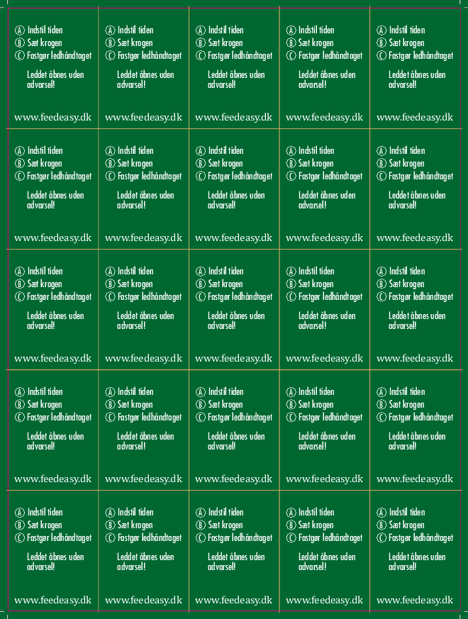 Klistermærker under A5-størrelse (148 x 210 mm) leveres på A4-ark. Klistermærker i A4-størrelse (210 x 297 mm) eller større leveres enkelt skåret. Ønsker du klistermærker leveret på en bestemt måde, kan du angive det som bemærkning til ordren. Der kan forekomme eventuelle tillægsomkostninger på 0,2 kr. pr. stk. i forbindelse med dette.